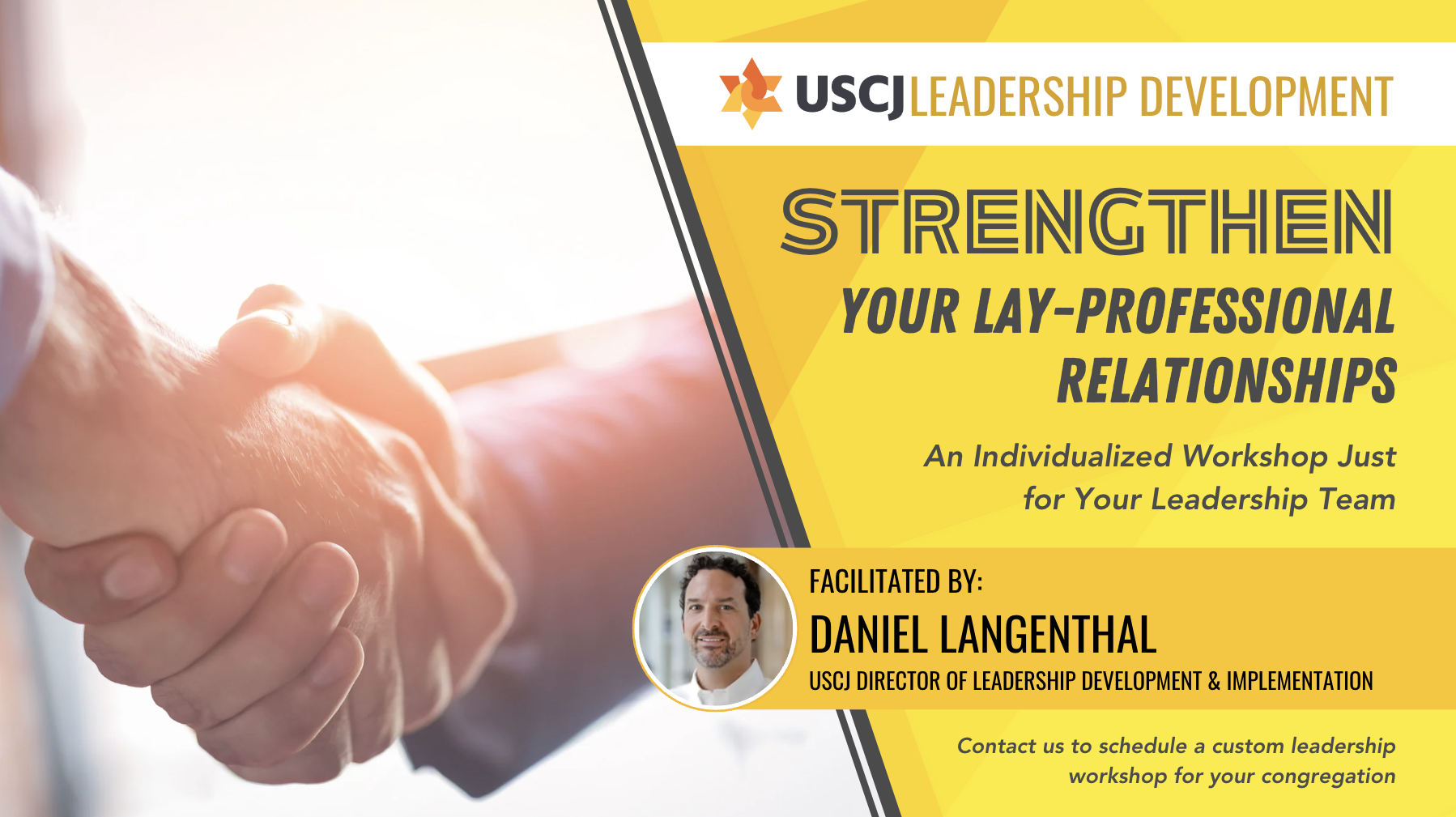 Are you ready to elevate your lay-professional team and create a thriving work environment? Join us for an individualized two-hour workshop designed for your board president, clergy, and executive director to collaborate and strengthen their leadership skills. Together, we will explore personal leadership strengths, manage communication and conflict, clarify roles and responsibilities, and identify community priorities. This workshop sets the tone for a successful year, empowering your team to reach new heights and enhance your congregation’s overall effectiveness. Don’t miss this opportunity to invest in your leadership journey! Contact Daniel Langenthal to schedule a custom leadership workshop for your congregation. |