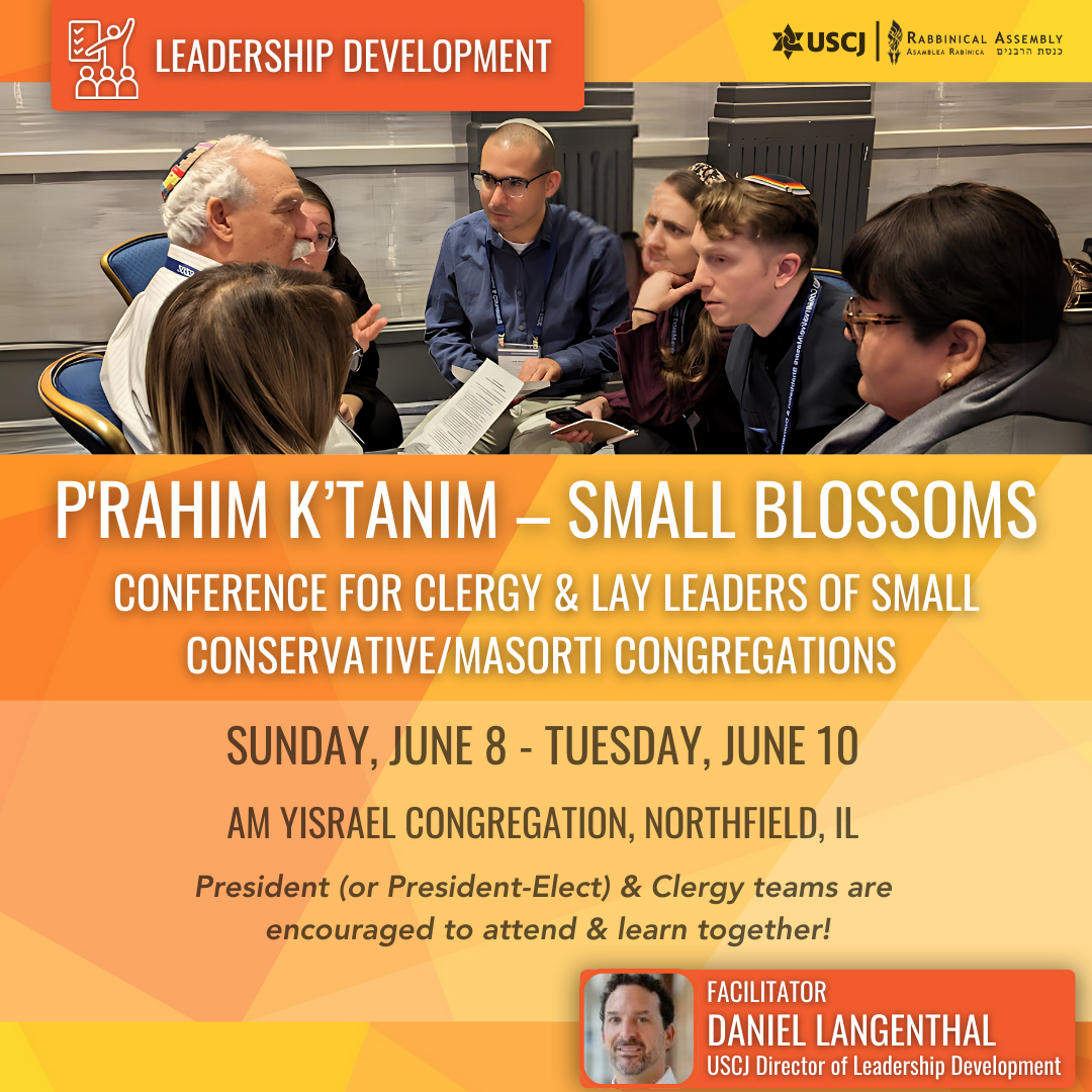 Join us for the Small Congregations Leadership Conference in Chicago this June! After a hiatus since 2019, this in-person event is the perfect opportunity for small congregations (250 member units or fewer) to reconnect and strengthen our community. Attendees will explore essential tools for enhancing lay-clergy relationships, strategies for building resilience in small synagogues, and engage in Limmud (learning), Tefilah (prayer), and Hizzuk (support). We encourage teams of clergy and presidents to attend together for a collaborative, interactive learning experience, guided by facilitators rather than traditional keynote speakers. Don’t miss this chance to network, share success stories, and develop new ideas—register now!