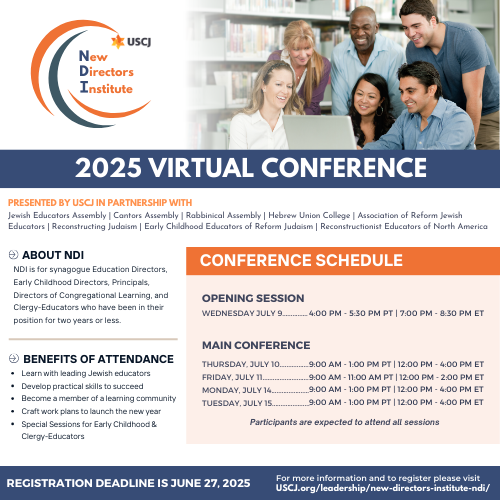 Welcome to the USCJ Events Page, your central hub for all upcoming trainings, webinars, and events designed to empower and connect our community. Whether you’re looking to enhance your leadership skills, stay informed on the latest trends in Jewish education, or network with peers across the movement, our diverse lineup of events has something for everyone. Explore our calendar and register today to stay engaged, inspired, and equipped to make a meaningful impact in your congregation and beyond. Don’t miss out on these opportunities to learn, grow, and lead!